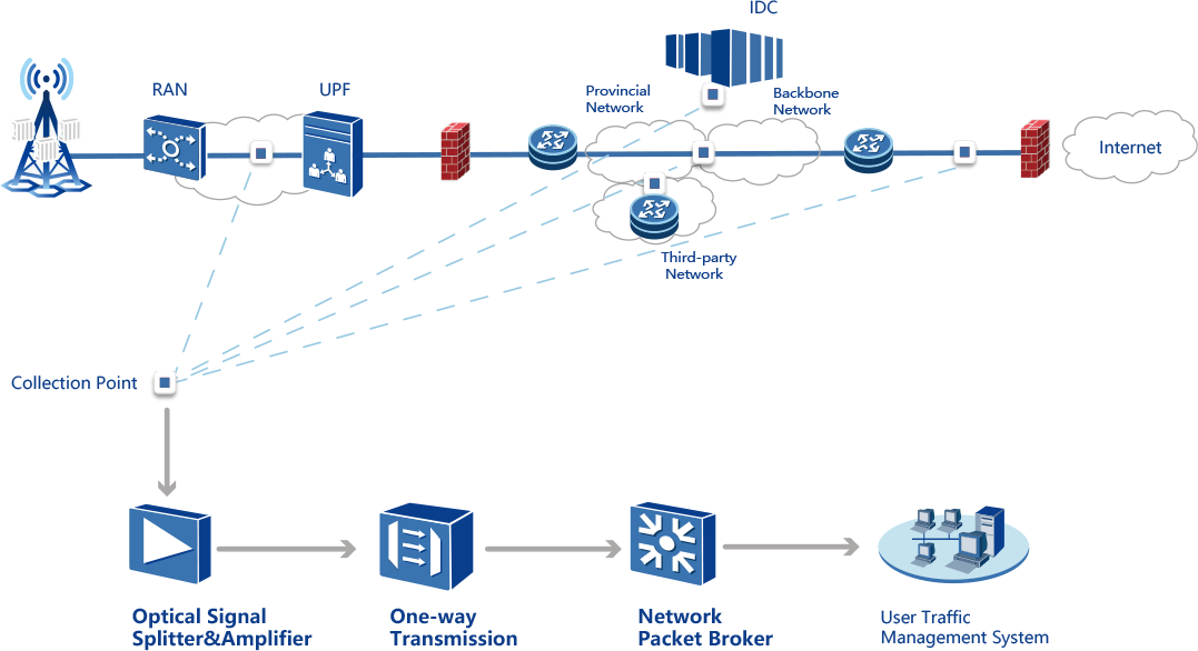 Based on the deployment characteristics of backbone network and metropolitan area network of telecom operators, in order to ensure the reliability of data links, network traffic is usually replicated by light splitting. Taking into account the problems of collecting weak light, back-end data analysis equipment and collection points not in the same server room, Accelink Technology Co. Ltd. has launched an overall solution for network visualization integrating beam splitting and amplification, lead transmission and data preprocessing to realize local and remote convergence and shunting of network traffic and meet the deployment needs of various types of traffic management, which is mainly applied to operators, enterprise networks and other fields.